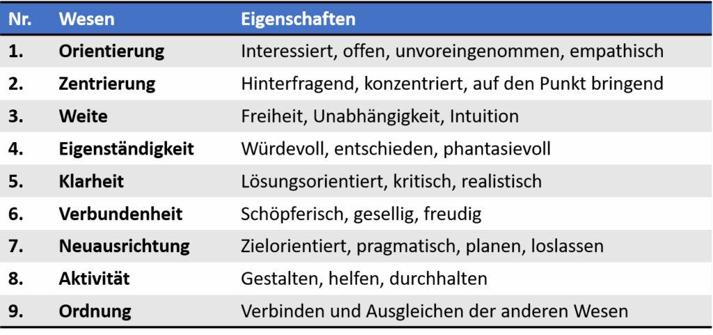 Sagen wir mal, unser Berater hat die wesentlichen Eigenschaften: konzentriert, kritisch und kreativ. Mit diesen drei zentralen Eigenschaften bringt er das „Klarheit schaffen“ zu einem Ausdruck. Danach richtet er die anderen Wesen aus. Wir können es in einem Bild darstellen:
