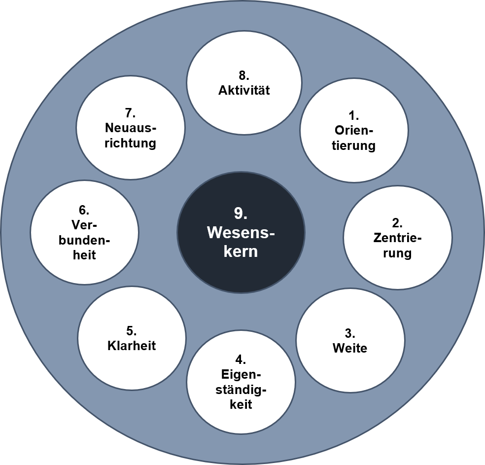 Im Zentrum ist der Wesenskern und drum herum sind die anderen Wesen angeordnet. Um Klarheit zu schaffen richtet der Berater die einzelnen Wesen nach seinen zentralen Eigenschaften aus: konzentriert, kritisch, kreativ. Weiter verbindet er die Wesen zu einem zusammenhängenden Prozess, der es ihm ermöglicht, in der Situation Klarheit zu schaffen. Das geschieht in folgenden Schritten: