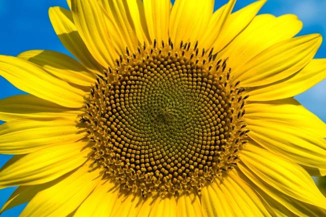 Die Sonnenblume ist ein Korbblütler. Das Innere des Korbes besteht aus zahlreichen einzelnen Röhrenblüten, die in Spiralen angeordnet sind. Dabei sind zwei Arten von Spiralen zu unterscheiden. Einerseits gehen Spiralen vom Zentrum aus, die sich, im Uhrzeigersinn orientiert, zum Rand des Korbes erstrecken. Andererseits gibt es Spiralen mit der umgekehrten Ausrichtung. Sie verlaufen vom Rand des Korbes im Uhrzeigersinn in Richtung Zentrum. Um den Blütenkorb sind die unfruchtbaren Strahlen- oder Zungenblüten angeordnet, die in ihrem freudigen gelb wie die Sonne wirken.