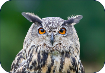 Bei einem Uhu fallen natürlich sofort die Augen auf, der starre Blick, mit dem er seine Umgebung wahrnimmt. Und dabei kann der Uhu nicht nur bei Tage sehen, sondern auch in der Nacht. Er bringt Klarheit ins Dunkel. Außerdem fallen die Ohren auf, die wie Federbüschel an seinem Kopf sitzen. Ansonsten wirkt der Uhu ruhend, er macht eigentlich nichts, außer die Umgebung aufmerksam zu beobachten.