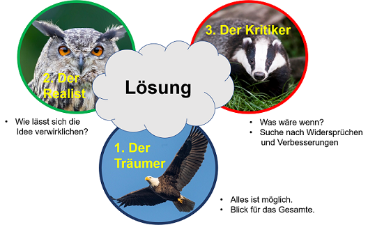 Hilfreich ist dabei die Walt-Disney-Methode, die von Robert Dilts herausgearbeitet wurde. Dabei wird eine Lösung, die entwickelt werden soll, aus verschiedenen Perspektiven betrachtet: Dem Träumer, dem Realisten und dem Kritiker. In unserem Gedankengebäude entspricht der Träumer dem Adler, der Realist dem Uhu und der Kritiker dem Dachs.