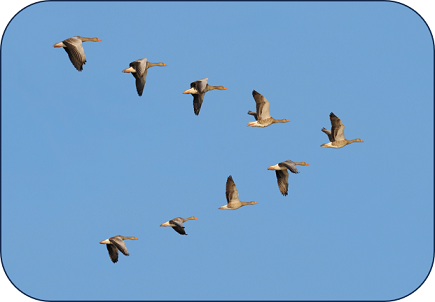 Wir finden die Eigenschaften der Neuausrichtung nicht nur bei einzelnen Tieren sondern auch im Miteinander – etwa bei einer Schar fliegender Gänse: