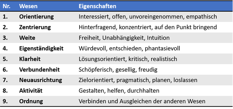 Diese neun Wesenheiten sind universell. Sie prägen einerseits unser menschliches Verhalten, wir finden sie aber auch bei den Tieren, den Pflanzen sowie in den täglichen Situationen und Dingen. Und dabei gibt es stets eine Wesenheit die dominiert – den Wesenskern. Und diesen Kern bringen wir mit spezifischen Eigenschaften zum Ausdruck. Er gibt uns eine Ordnung im Leben. Doch betrachten wir ein Beispiel: