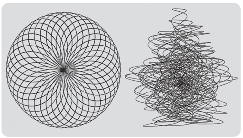 Betrachten wir eine Teilchenbahn. Das linke Bild zeigt ein geordnetes, harmonisches Muster, während die rechte Abbildung ein Durcheinander darstellt: